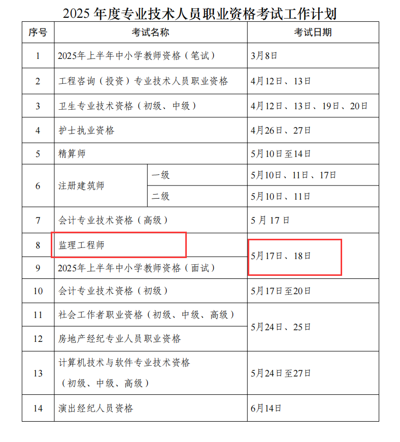 2025年江西监理工程师考试时间公布,定于5月17日-5月18日。