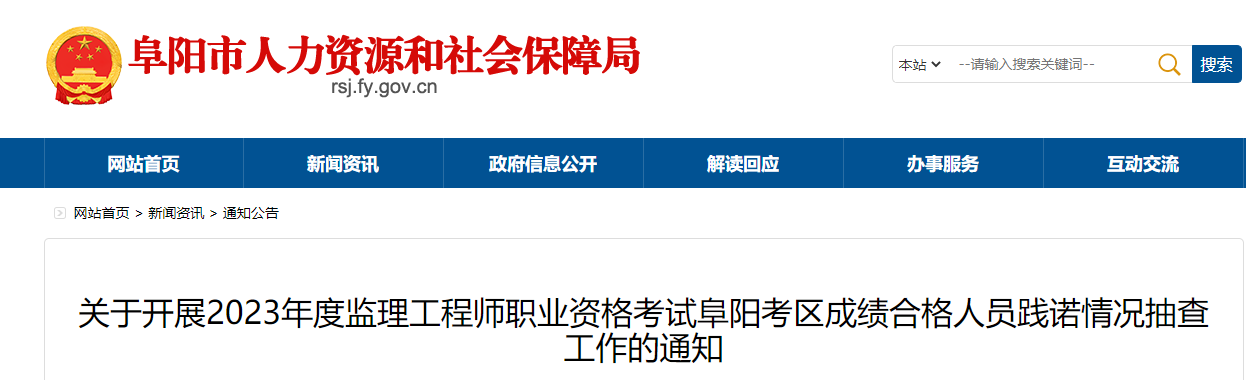 根据省人力资源社会保障厅、省住房和城乡建设厅、省交通运输厅、省水利厅《关于2023年度监理工程师职业资格考试安徽考区考务工作有关事宜的通知》(皖人社秘〔2023〕45号)及资格考试报名证明事项告知承诺制有关要求,拟于近期开展阜阳考区2023年度监理工程师职业资格考试成绩合格人员践诺情况随机抽查工作,现将有关情况通知如下。