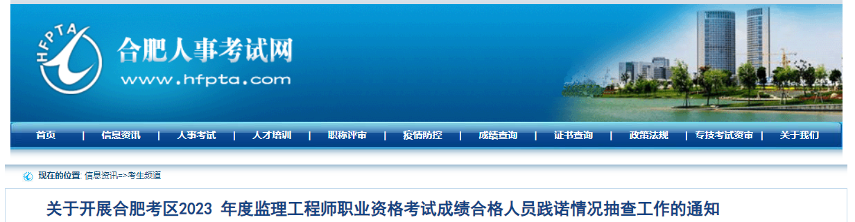根据省人力资源社会保障厅、省住房和城乡建设厅、省交通运输厅及省水利厅《关于2023年度监理工程师职业资格考试安徽考区考务工作有关事宜的通知》(皖人社秘〔2023〕45号)及资格考试报名证明事项告知承诺制有关要求,拟于近期开展合肥考区2023 年度监理工程师职业资格考试成绩合格人员践诺情况随机抽查工作,现将有关情况通知如下。
