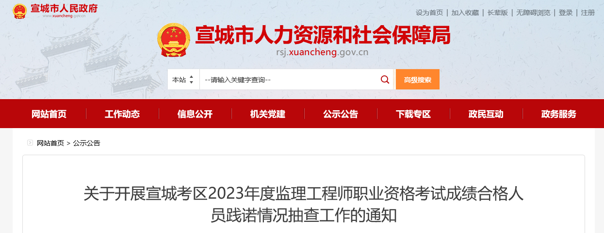 根据省人力资源社会保障厅、省住房和城乡建设厅、省交通运输厅及省水利厅《关于2023年度监理工程师职业资格考试安徽考区考务工作有关事宜的通知》(皖人社秘〔2023〕45号)及资格考试报名证明事项告知承诺制有关要求,拟于近期开展宣城考区2023年度监理工程师职业资格考试成绩合格人员践诺情况随机抽查工作,现将有关情况通知如下。