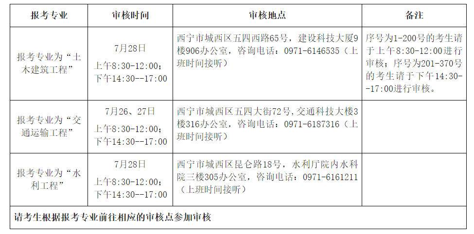报考专业为“土木建筑工程”的考生只需携带原件,无需复印件。报考专业为“交通运输工程”和“水利工程”的考生需携带原件及复印件,学信网查不到学历认证报告的请携带学籍档案材料。若本人不在西宁,可委托他人携带原件进行审核。