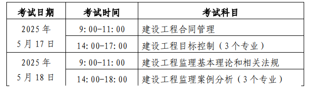 2025年北京注册监理工程师考试共设四门科目,分别是《建设工程合同管理》、《建设工程目标控制》、《建设工程监理基本理论与相关法规》和《建设工程监理案例分析》。考试时间为5月17日-5月18日,具体考试安排如下:
