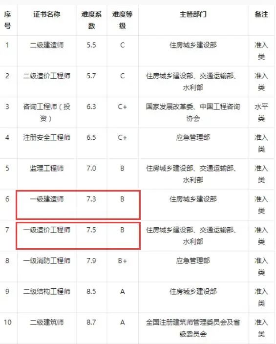 总结:从上图可以看出,一级造价工程师和一级建造师考试难度是一个等级的,而一造考试难度系数是略高于一建的,所以就考试难度而言,一级造价工程师考试难度略高于一级建造师。