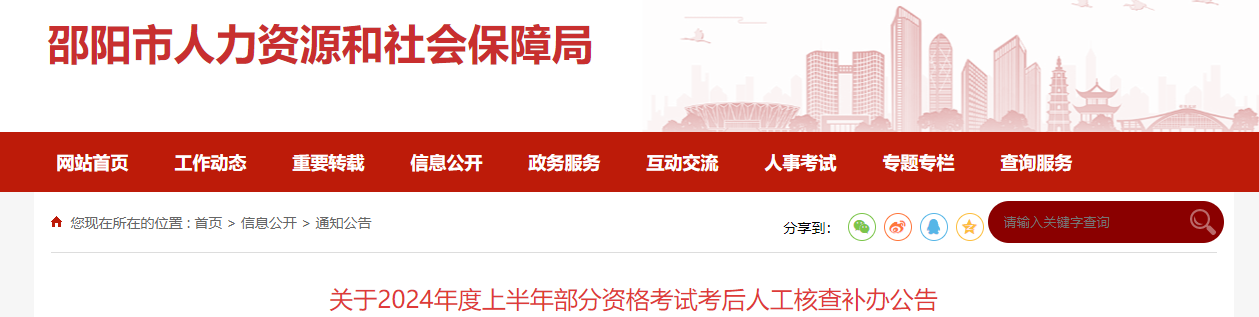 (四)人工核查结果公示。将在邵阳市人力资源和社会保障局官方网站公示人工核查结果以及报名服务平台核验通过的成绩合格人员名单。经公示无异议的成绩合格人员的证书领取事宜在“湖南人事考试网(www.hunanpea.com)”和邵阳市人力资源和社会保障局官方网站予以公告,请相关人员及时关注并按要求领取。