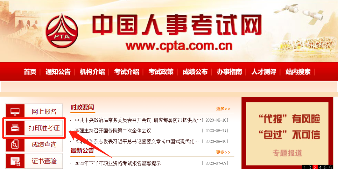 进入中国人事考试网,找到左侧【准考证打印】入口,点击进入。