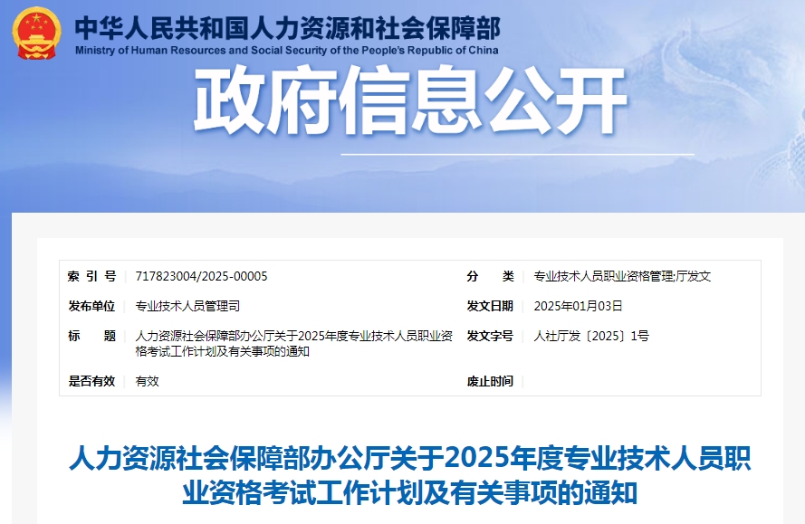 人力资源社会保障部办公厅关于2025年度专业技术人员职业资格考试工作计划及有关事项的通知