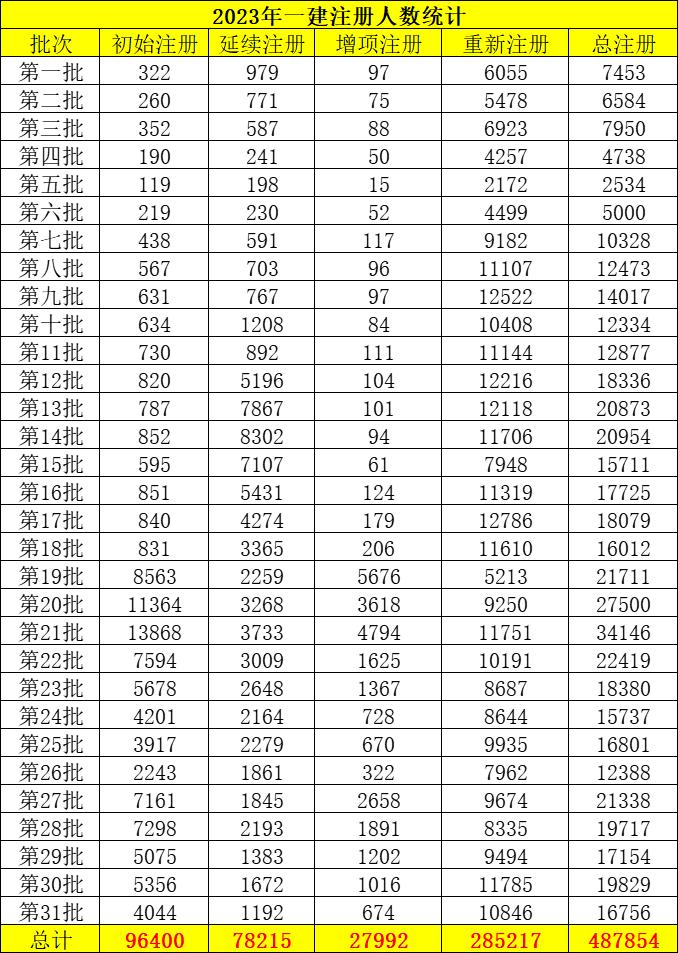 住建部已公布第1-31批一级建造师注册人员名单公告,共487854人符合一级建造师注册条件。其中,初始注册共96400人,延续注册78215人,增项注册27992人,重新注册285217人。具体公告如下: