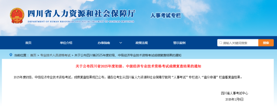 四川2025年初级经济师考试成绩复核结果已公布!相关考生请尽快在四川省人力资源和社会保障厅官网“人事考试”专栏进入“查分申请”栏查看复查结果,确认成绩变动情况。