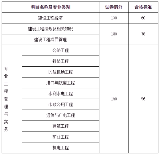 《专业工程管理与实务》科目的考试总分为160分,及格分数为96分。