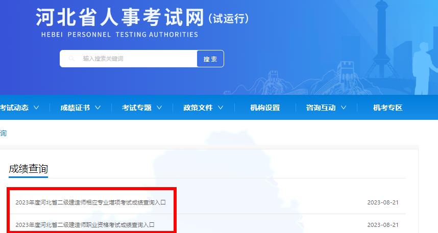 2023河北二建成绩查询入口8月21日已开通,考生请登录河北人事考试网进入成绩查询栏目查询成绩。