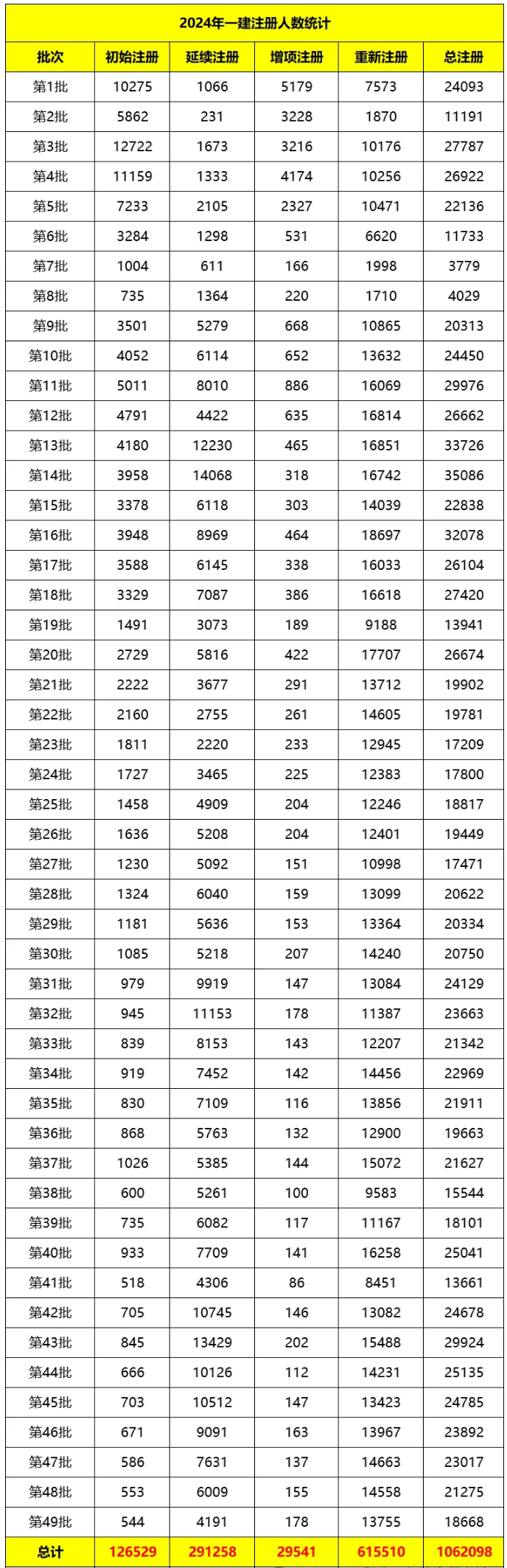 截止目前,住建部共公布了1-49批一建注册人员名单,总共1062098人通过注册。其中,初始注册人数为126529人,占比11.91%;延续注册共291258人,占比27.42%;增项注册共29541人,占比2.78%;重新注册615510人,占比57.95%。具体如下: