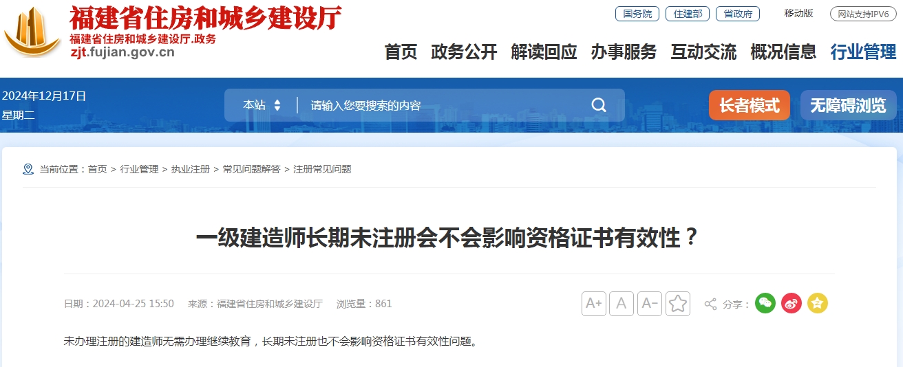 针对“一级建造师长期未注册会不会影响资格证书有效性”的疑问,福建省住建厅明确表示: