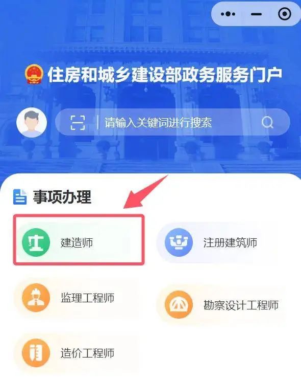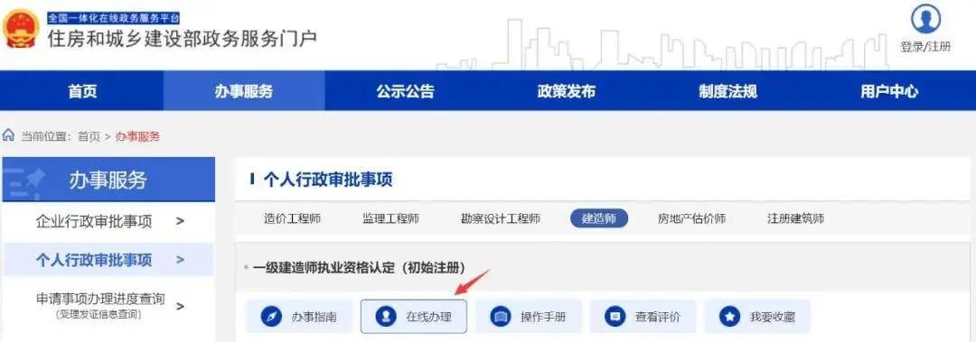电脑登录【住房和城乡建设部政务服务门户】→ 点击【办事服务】→ 点击【个人行政审批事项】→ 选择【建造师】→ 选择【一级建造师执业资格认定(初始注册)】。