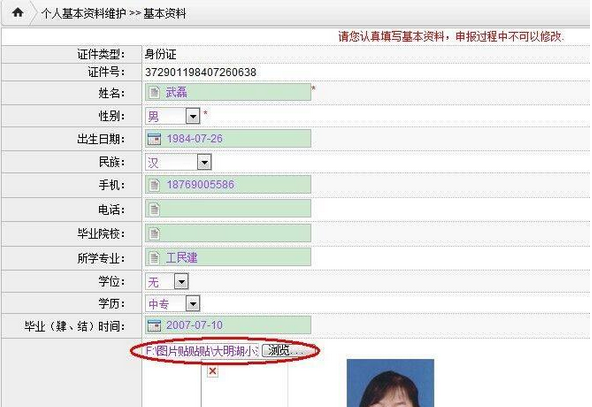 4、上传照片。考生须上传近期6个月内正面免冠证件数码彩色照片。上传前,必须使用网上报名流程中提供的“照片处理工具”将照片处理成宽120X高160像素,以保证格式的正确。