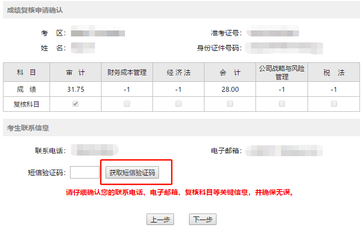 3. 选择需要复核的科目,获取验证码,点击下一步即可。