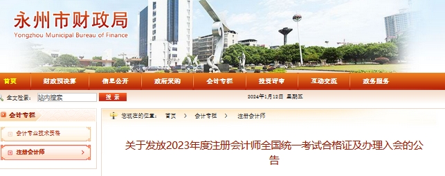 2024年1月12日,永州市财政局发布了《关于发放2023年度注册会计师全国统一考试合格证及办理入会的公告》,请携带本人有效身份证原件前往综合阶段考试网上报名时填写的合格证领取地市州注协领取全科合格证。