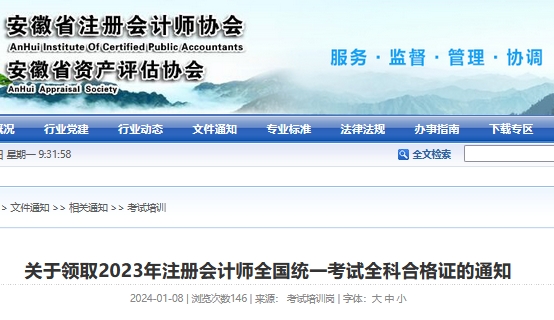 2024年1月8日,安徽注册会计师协会发布了《关于领取2023年注册会计师全国统一考试全科合格证的通知》,2023年安徽注册会计师合格证即日起(1月8日)可网上申领。
