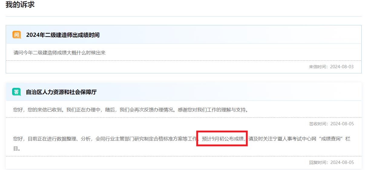 根据此前宁夏人力资源和社会保障厅的回复,2024年宁夏二建成绩预计在9月份公布,因此建议大家在近期多关注宁夏人事考试中心的相关查分信息,我们也将及时为大家更新。