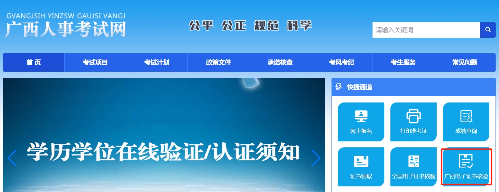 1.进入广西人事考试网主页(https://www.gxpta.com.cn/),找到右侧的“广西电子证书核验”栏目并点击进入。