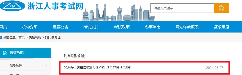 2024浙江二级建造师准考证打印官网:浙江人事考试网(http://zjks.rlsbt.zj.gov.cn/)