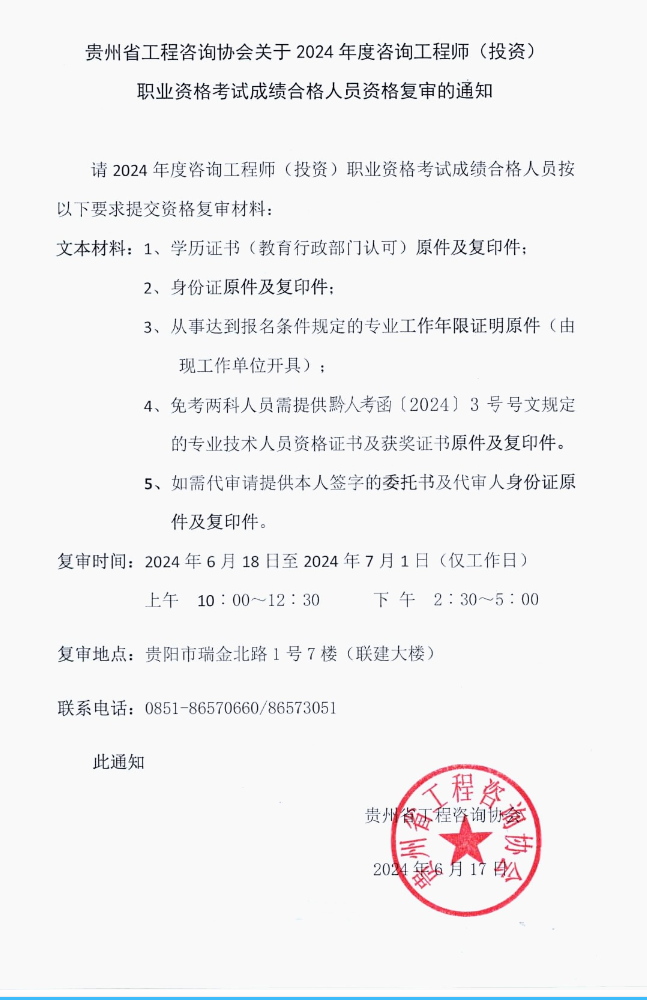 贵州省工程咨询协会发布关于2024年度咨询工程师(投资)职业资格成绩合格人员考后资格复核的通知,从中得知复核时间是2024年6月18日至2024年7月1日。