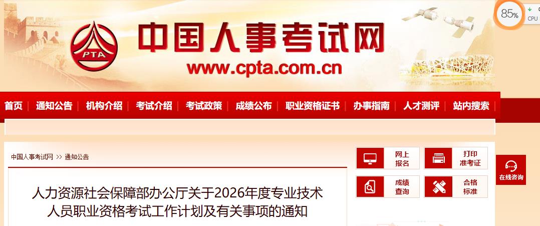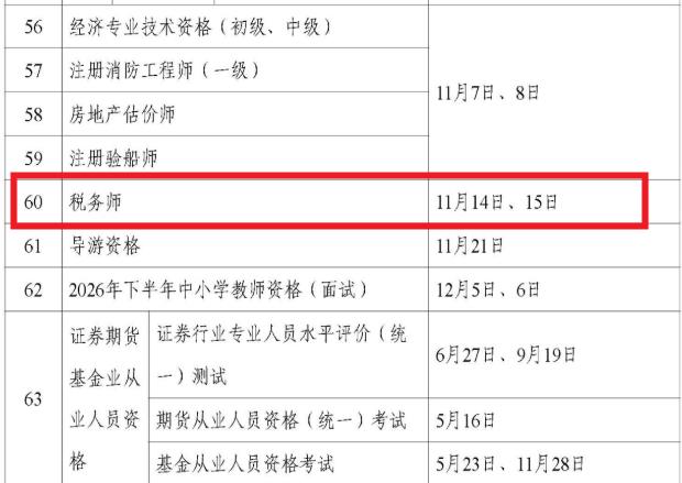 人社部在中国人事考试网发布了《人力资源社会保障部办公厅关于2026年度专业技术人员职业资格考试工作计划及有关事项的通知》,其中涉及2026年税务师考试时间,确定为11月14日、15日,请相关人员做好考试准备。