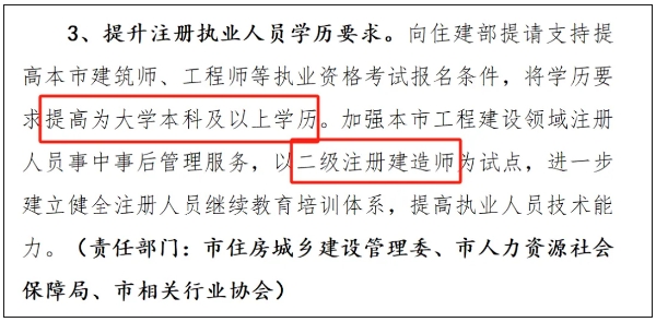 一是提升注册执业人员的学历要求,将建筑师、工程师等执业资格考试的报名条件中的学历要求提高为大学本科及以上;