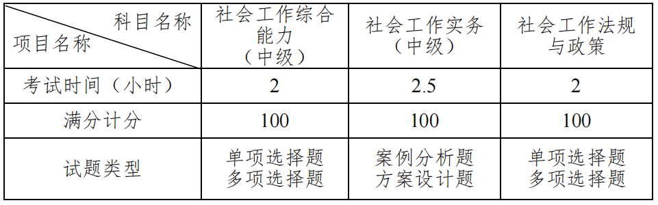 考试科目:《社会工作综合能力(中级)》、《社会工作实务(中级)》、《社会工作法规与政策》共3科