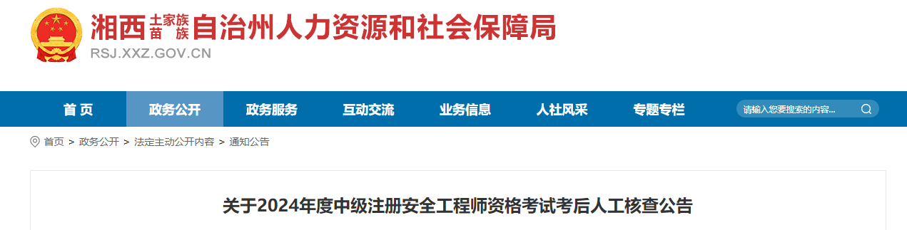 12月27日,湘西土家族苗族自治州人力资源和社会保障局发布了“关于2024年度中级注册安全工程师资格考试考后人工核查公告”,人工核查时间:2025年1月2日(上午8:00-12:00,下午14:30-17:30)。