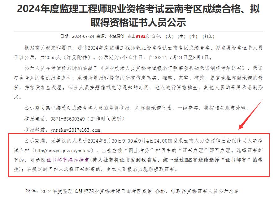 1、2024年度云南监理工程师成绩合格人员公示期满以后,无异议的人员于2024年8月30日9:00至9月4日24:00前登录云南人力资源和社会保障网人事考试专栏(http://hrss.yn.gov.cn/ynrsksw),点击左侧“网上考务”栏目中的“证书办理”即可办理。