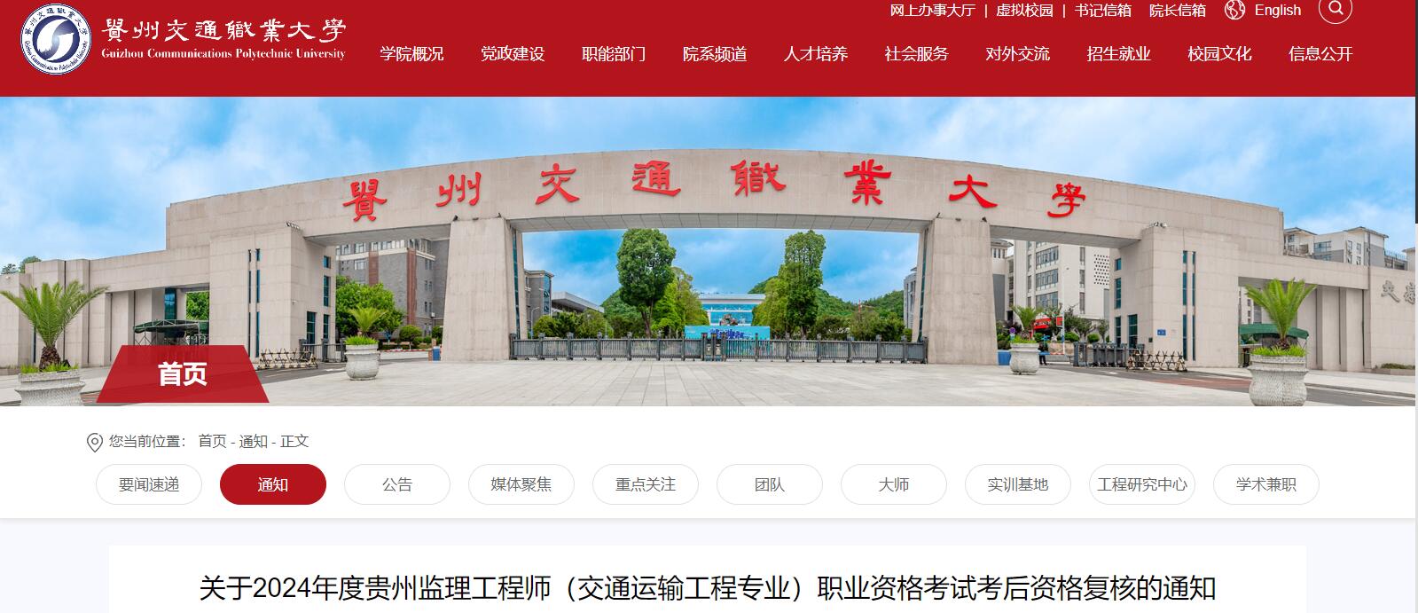 7月29日,贵州交通职业技术学院发布了“关于2024年度贵州监理工程师(交通运输工程专业)职业资格考试考后资格复核的通知”,复核时间:2024年8月7日-8月9日。