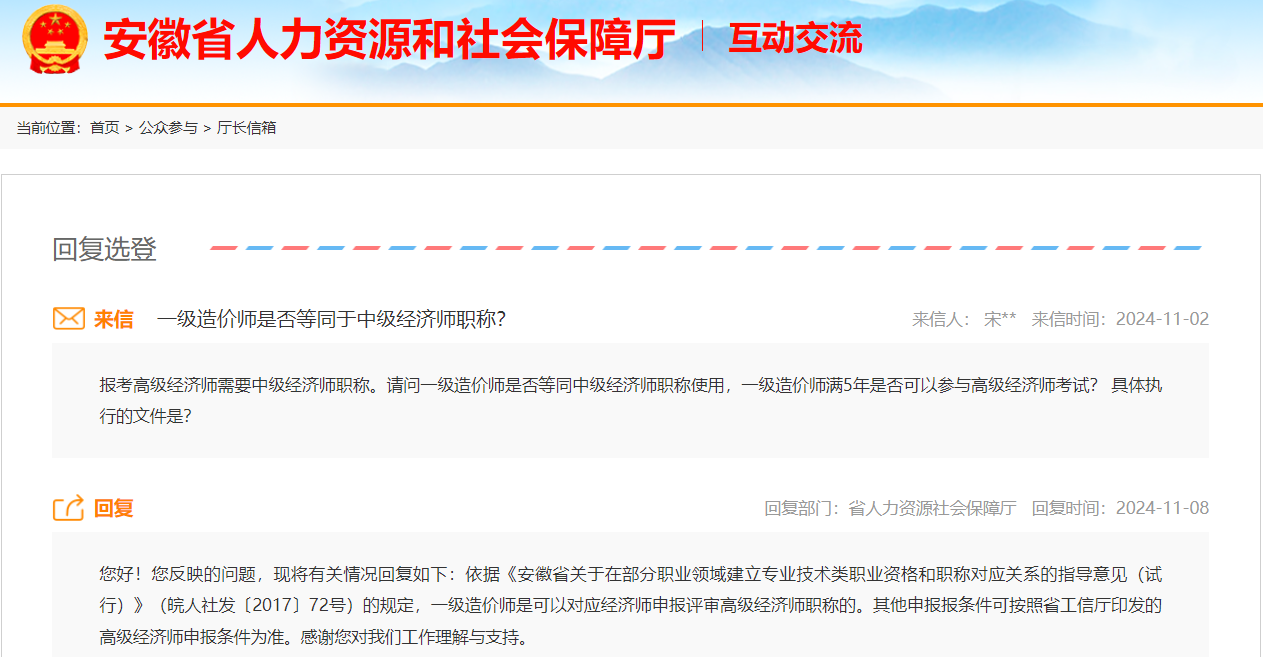 近日,有网友提出疑问:“一级造价师是否等同于中级经济师职称?”对此,安徽省人力资源和社会保障厅回复,一级造价师可以对应经济师申报评审高级经济师职称的。