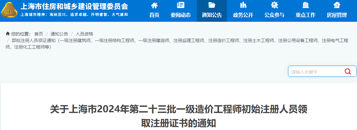 上海市2024年第23批一级造价师初始注册证书领取通知原文如下: