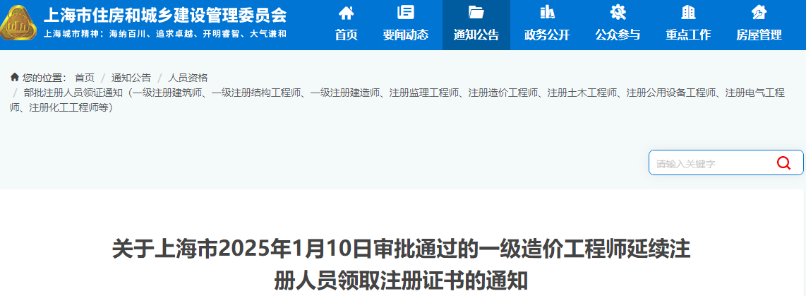 2025年1月17日,上海市住房和城乡建设管理委员会发布了《关于上海市2025年1月10日审批通过的一级造价工程师延续注册人员领取注册证书的通知》,其中明确该地一级造价师证书延续注册已办结,相关人员可进行现场领证或邮寄领取。