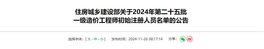 2024年11月26日,中华人民共和国住房和城乡建设部发布了《关于2024年第二十五批一级造价工程师初始注册人员名单的公告》,其中明确共有1264人符合一级造价师初始注册条件,准予注册。