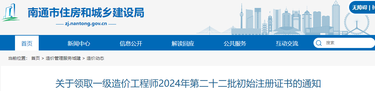 南通市2024年第二十二批一级造价师初始注册证书领取通知原文如下: