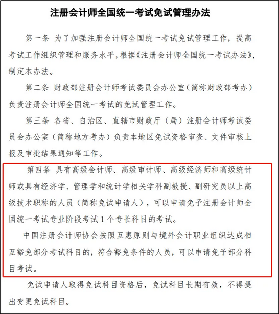 CPA免试是全国统一的,根据中注协发布的《注册会计师全国统一考试免试管理办法》,CPA免考人群主要有三类: