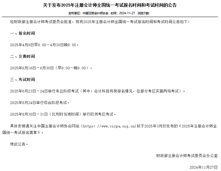 2025年cpa报名时间为4月8日早8:00-4月30日晚8:00,考试时间为8月23日-24日。注册会计师全国统一进行报名、考试,每年仅组织一次,大家千万不要错过重要时间。