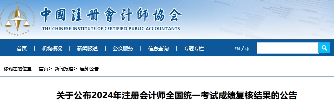 2025年1月23日,中国注册会计师协会发布了《关于公布2024年注册会计师全国统一考试成绩复核结果的公告》,考生登录“注册会计师全国统一考试网上报名”系统查询本人2024年注册会计师全国统一考试成绩复核结果。