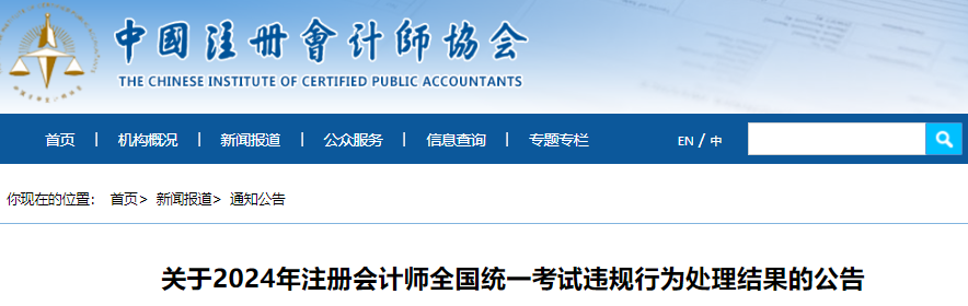 根据《注册会计师全国统一考试违规行为处理办法》(财政部令第57号),相关省级注协对2024年注册会计师全国统一考试中违规应考人员作出相应处理。现将处理结果予以公布。