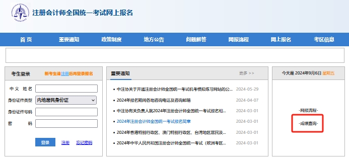 2024年注册会计师考试成绩查询入口已开通,成绩查询时间:11月22日8时起,可通过访问注册会计师全国统一考试网上报名系统(简称网报系统,https://cpaexam.cicpa.org.cn),或进入移动端查询成绩。