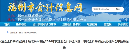 根据福建省注册会计师协会通知,2024年度注册会计师全国统一考试全科合格证书已制作完成,现将福州考区考生领取证书及办理入会事项通告如下: