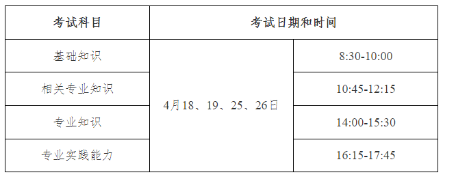 每个专业都有4个科目:「基础知识」、「相关专业知识」、「专业知识」、「专业实践能力」。4个科目都是在一天内考完。每一个科目考试时间90分钟,满分100分,60分合格。