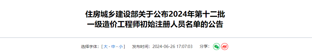 2024年第十二批一级造价师初始注册人员名单公告原文如下: