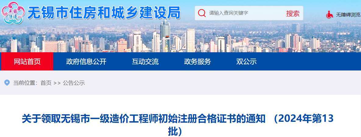 2024年7月22日,无锡市住房和城乡建设局发布了《关于领取无锡市一级造价工程师初始注册合格证书的通知 (2024年第13批)》,其中明确无锡2024年第13批一级造价师初始注册已办结,合格人员需尽快领证。