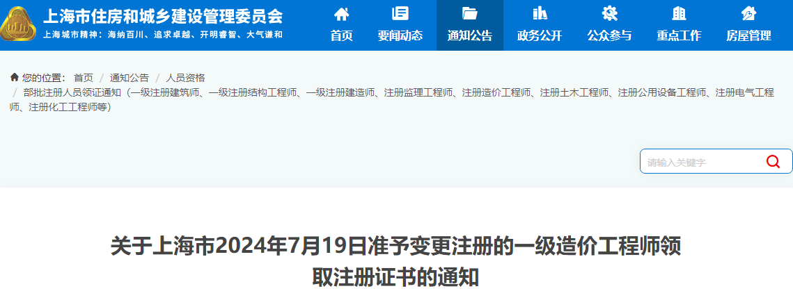 上海市2024年7月19日准予变更注册的一级造价师注册证书领取通知原文如下: