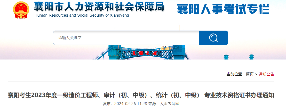 2024年2月26日,襄阳市人力资源和社会保障局发布了《襄阳考生2023年度一级造价工程师、审计(初、中级)、统计(初、中级)专业技术资格证书办理通知》,其中明确襄阳市2023年度一级造价师证书开始发放,纸质证书可通过窗口或网上办理,电子证书可在“中国人事考试网”下载。