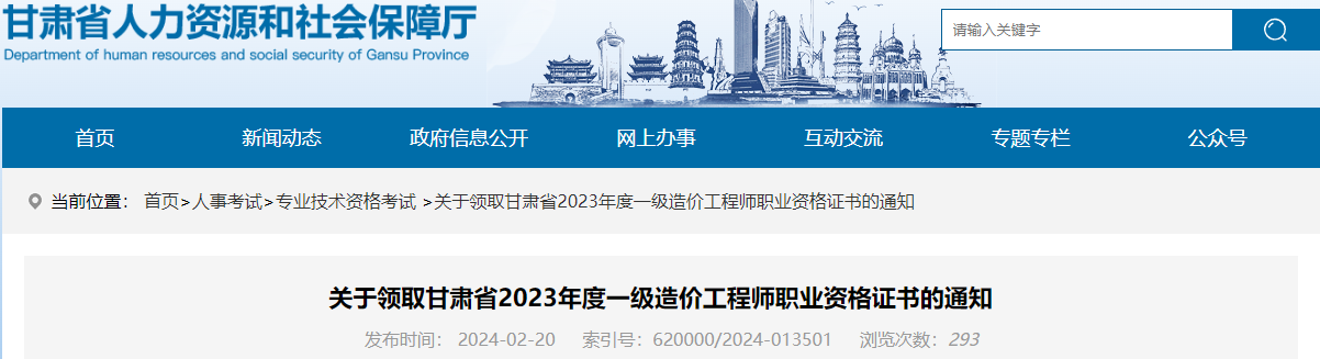2024年2月20日,甘肃省人力资源和社会保障厅发布了《关于领取甘肃省2023年度一级造价工程师职业资格证书的通知》,其中明确甘肃一级造价师证书即日起发放,考生可进行邮寄办理或现场领取。