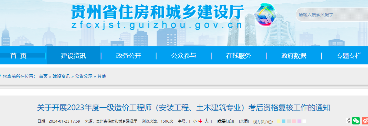 2024年1月23日,贵州省住房和城乡建设厅发布了《关于开展2023年度一级造价工程师(安装工程、土木建筑专业)考后资格复核工作的通知》,其中明确2023年一级造价师安装、土建成绩合格人员需在2月4日前完成考后审核,并对审核流程、注意事项等作出具体要求。