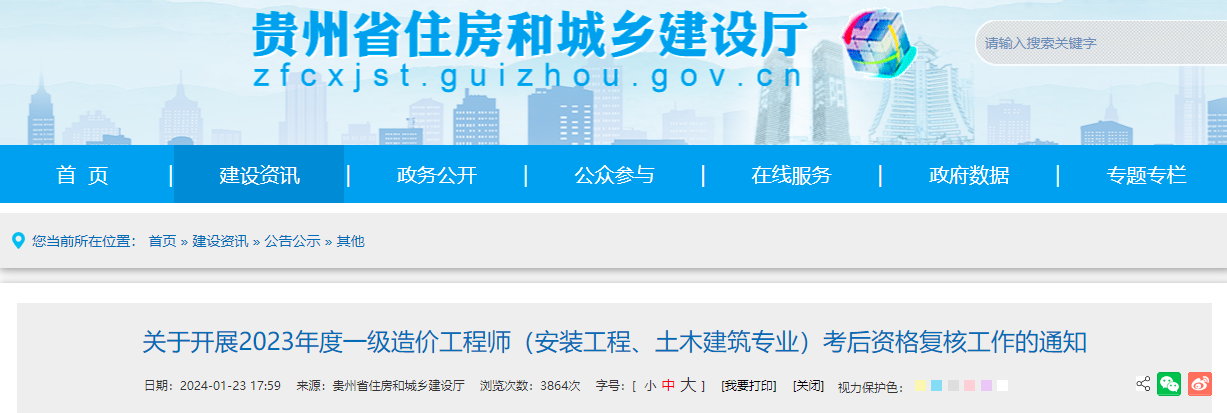 2024年1月25日,贵州省住房和城乡建设厅发布了《2023年度一级造价工程师(安装工程、土木建筑专业)考后资格复核常见问题解答》,对审核过程中材料提交、工作经历证明开具等常见问题作出解答。